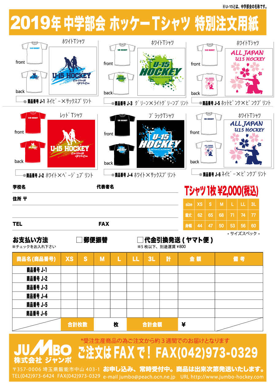 今年もジャンボさんのご協力のもと、U15ホッケーTシャツを作成しました。
